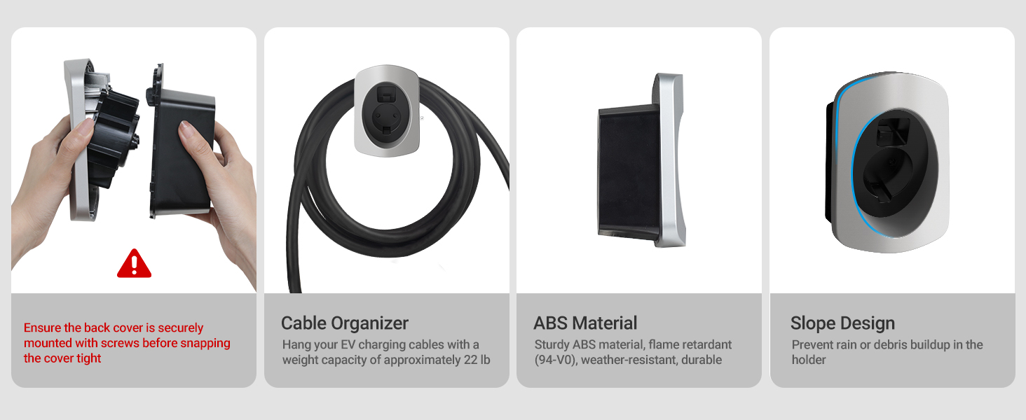 The ev charger holster dock is easy to install and use, it only takes a few minutes to mount quickly and easily to the wall, then insert the EV charger into the dock until it clicks into place.
